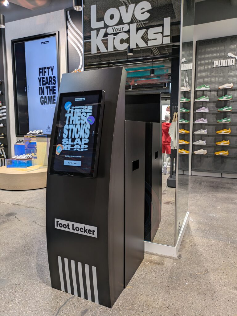 At the “Creation Station,” guests used 55” and 22” touchscreens to customise either a digital sneaker or basketball. After choosing colours, patterns, and graphics, their final designs were printed as physical sticker sets and also saved as digital assets. This multi-layered interaction encouraged creativity, longer dwell time, and meaningful brand connection, while the content lived on through social shares and physical keepsakes.